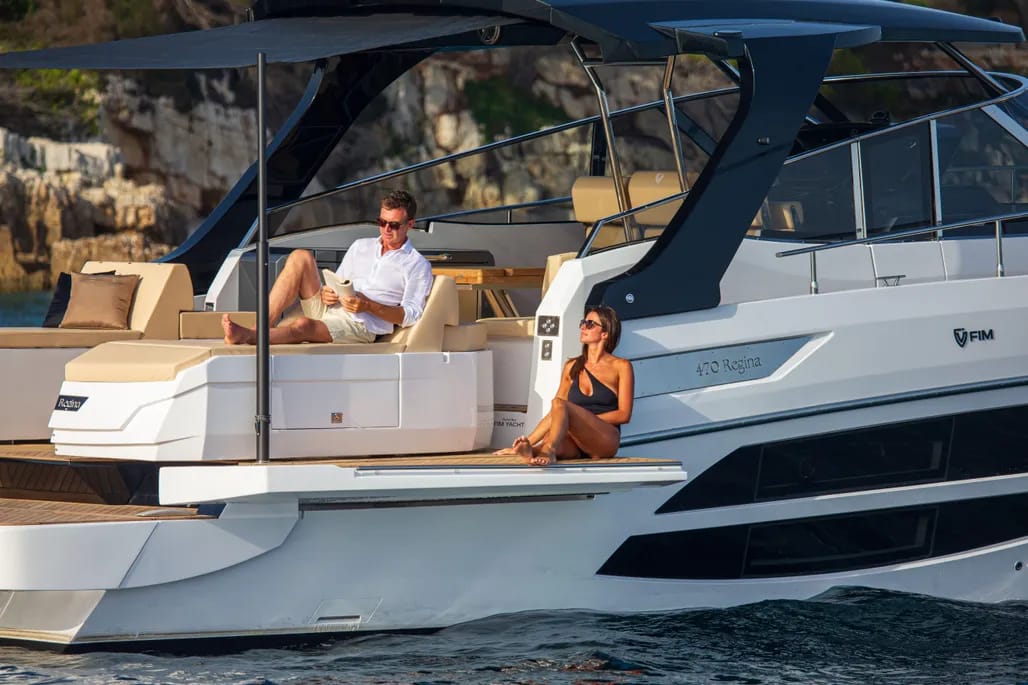 El FIM 470 Regina es un yate de motor que combina elegancia, versatilidad y un rendimiento excepcional, diseñado para quienes buscan disfrutar de la navegación en su máxima expresión. Con una eslora de 14,3 metros, este impresionante barco es ideal para escapadas familiares o para compartir momentos inolvidables con amigos. Su diseño exterior presenta líneas modernas y un casco aerodinámico, que no solo mejora la estética, sino que también garantiza estabilidad y eficiencia en el agua.
