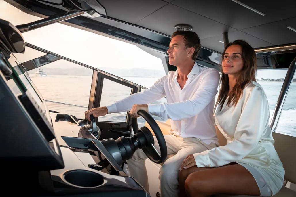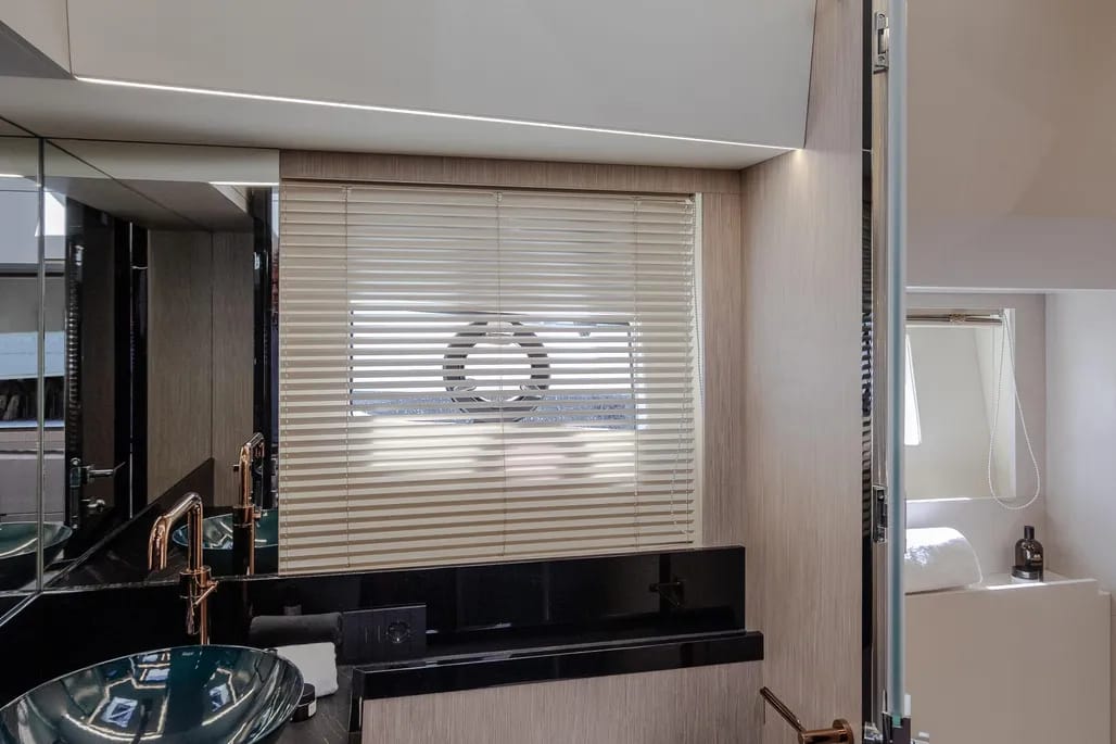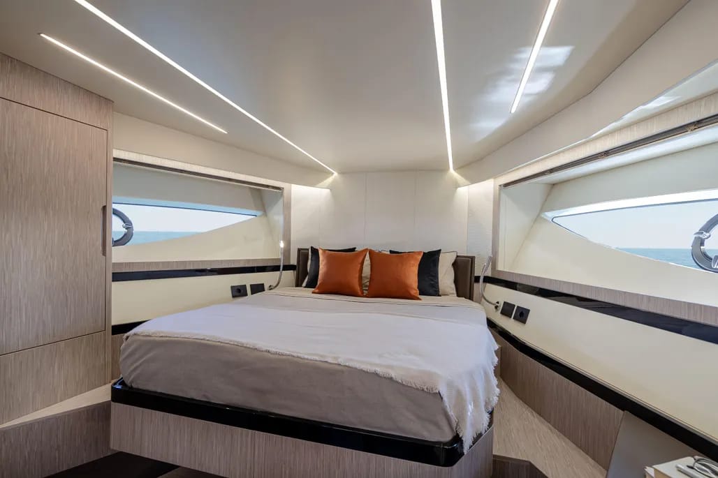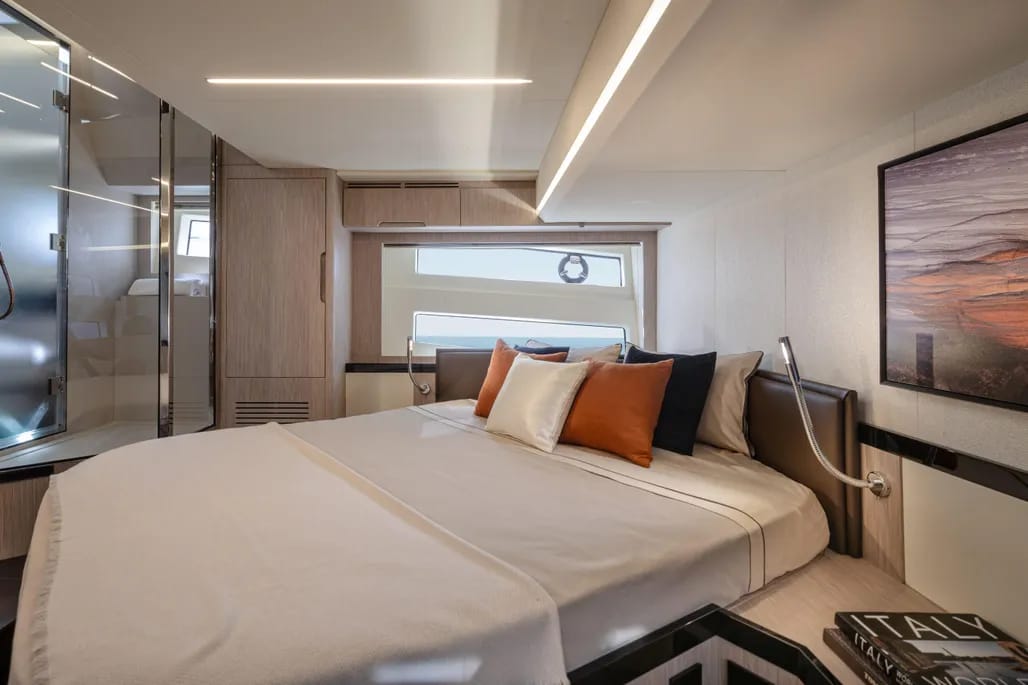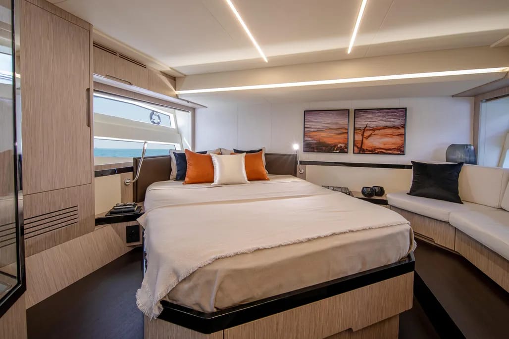 El interior del yate es un verdadero refugio, con un diseño contemporáneo y acabados de alta calidad. La espaciosa sala de estar cuenta con grandes ventanales que ofrecen vistas panorámicas y una abundante luz natural. La cocina está completamente equipada, facilitando la preparación de deliciosas comidas a bordo, mientras que las cabinas, confortables y bien diseñadas, garantizan privacidad y descanso.